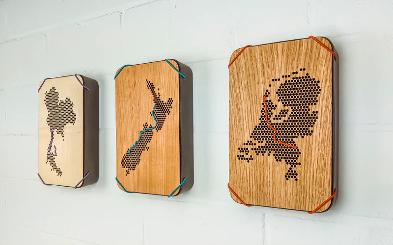 Die Unterteile der Questlogs bestehen aus einem Holz-Kunststoff-Verbundstoff, der bei jedem Questlog eine einzigartige Marmorierung bildet. Der Deckel besteht aus Edelfurnier, dessen Maserung ebenfalls bei jedem Questlog naturgemäß einzigartig ist. Deine persönliche Reiseroute macht das Questlog zum Unikat.
