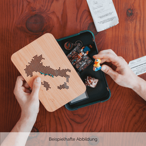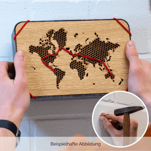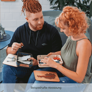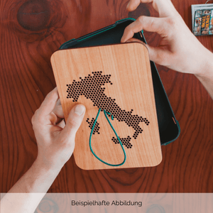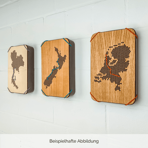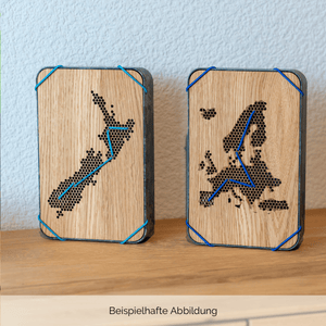 Die Unterteile der Questlogs bestehen aus einem Holz-Kunststoff-Verbundstoff, der bei jedem Questlog eine einzigartige Marmorierung bildet. Der Deckel besteht aus Edelfurnier, dessen Maserung ebenfalls bei jedem Questlog naturgemäß einzigartig ist. Deine persönliche Reiseroute macht das Questlog zum Unikat.