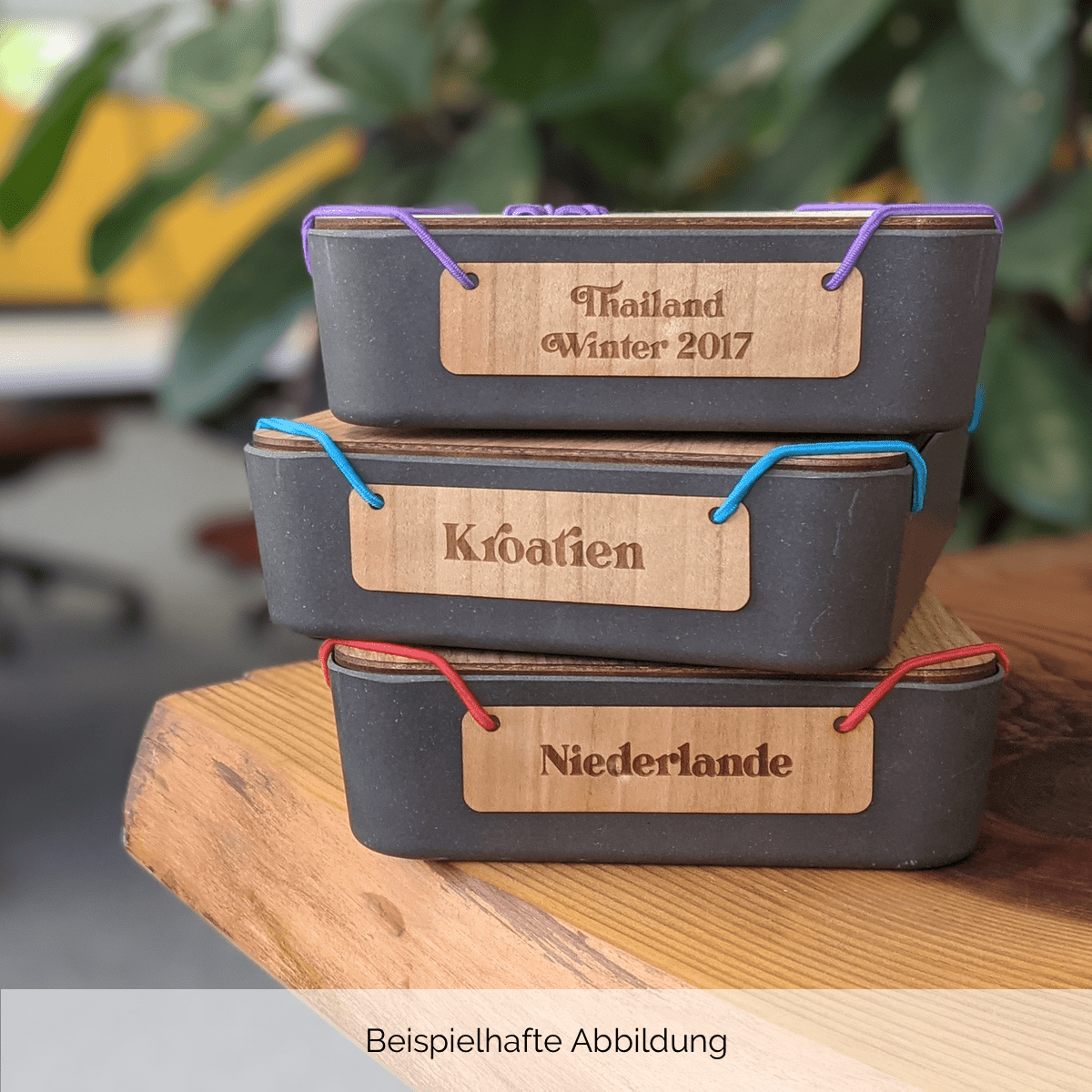 Die Unterteile der Questlogs bestehen aus einem Holz-Kunststoff-Verbundstoff, der bei jedem Questlog eine einzigartige Marmorierung bildet. Der Deckel besteht aus Edelfurnier, dessen Maserung ebenfalls bei jedem Questlog naturgemäß einzigartig ist. Deine persönliche Reiseroute macht das Questlog zum Unikat.