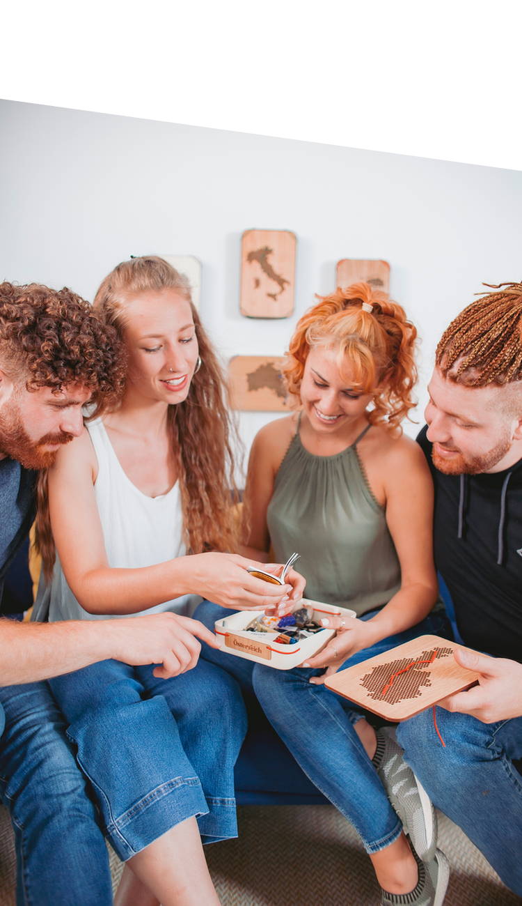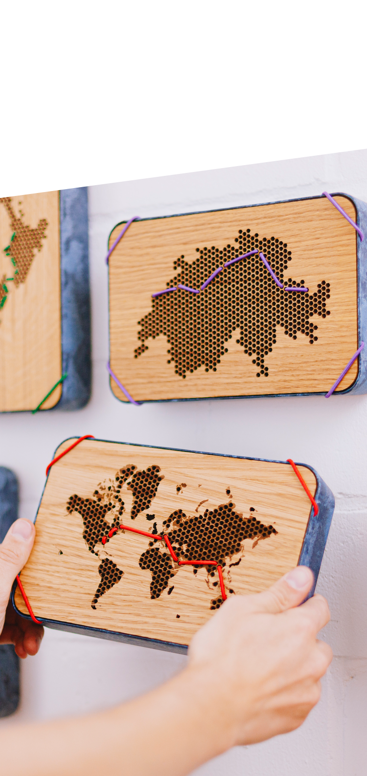 Die Unterteile der Questlogs bestehen aus einem Holz-Kunststoff-Verbundstoff, der bei jedem Questlog eine einzigartige Marmorierung bildet. Der Deckel besteht aus Edelfurnier, dessen Maserung ebenfalls bei jedem Questlog naturgemäß einzigartig ist. Deine persönliche Reiseroute macht das Questlog zum Unikat.